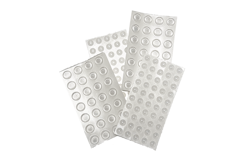 Gummifot 3008 är knappformad/halvcirkelformad, har en diameter på 8 mm och en höjd på 1,6 mm. Finns tillgänglig som svart och transparent.